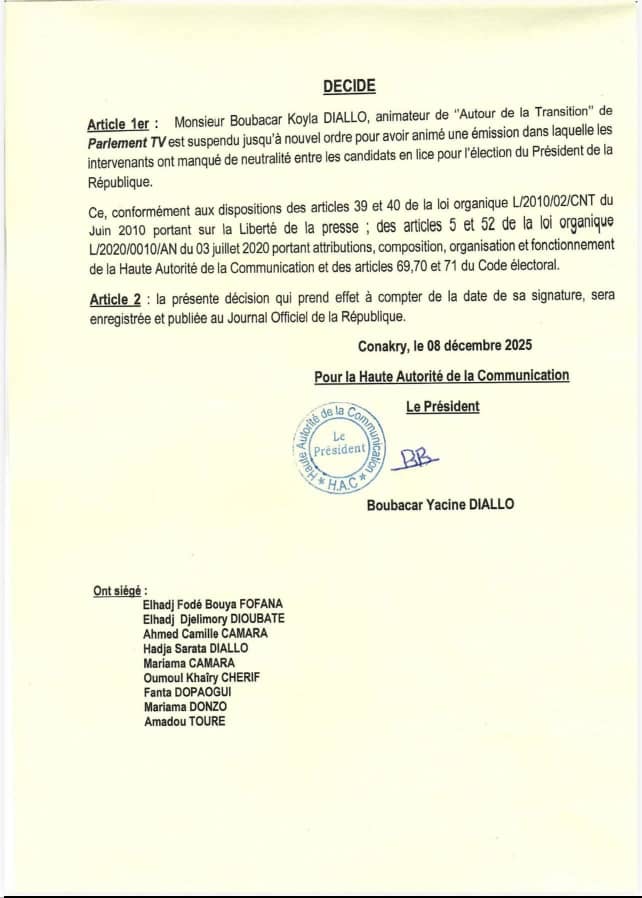 La Haute Autorité de la Communication (HAC) a annoncé ce lundi la suspension jusqu’à nouvel ordre, du journaliste Boubacar Koyla Diallo, animateur de l’émission « Autour de la Transition » diffusée sur la chaîne Parlement TV.