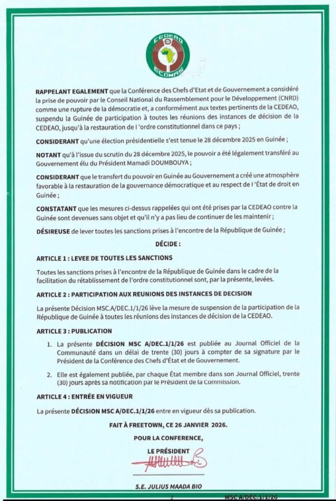 La Communauté économique des États de l’Afrique de l’Ouest (CEDEAO) a officiellement annoncé la levée de l’ensemble des sanctions prises à l’encontre de la République de Guinée. Ce qui marque la fin d’un long processus de retour à l’ordre constitutionnel engagé depuis le coup d’État du 5 septembre 2021.